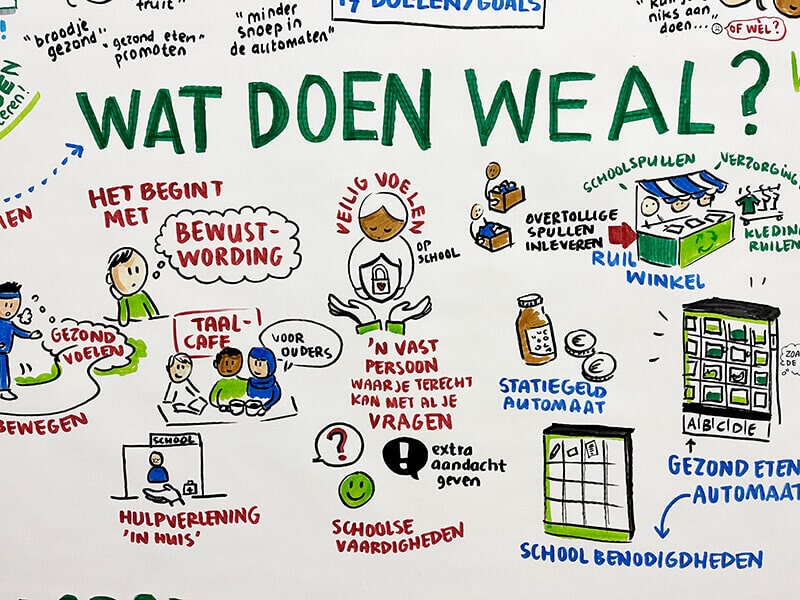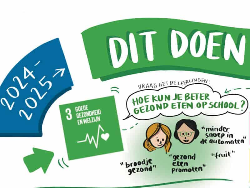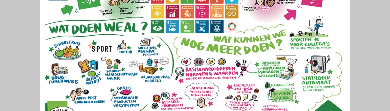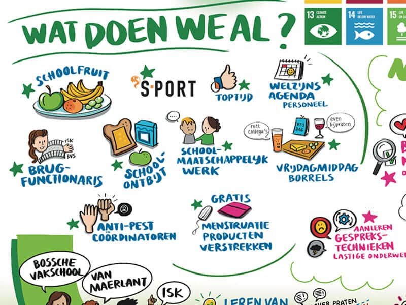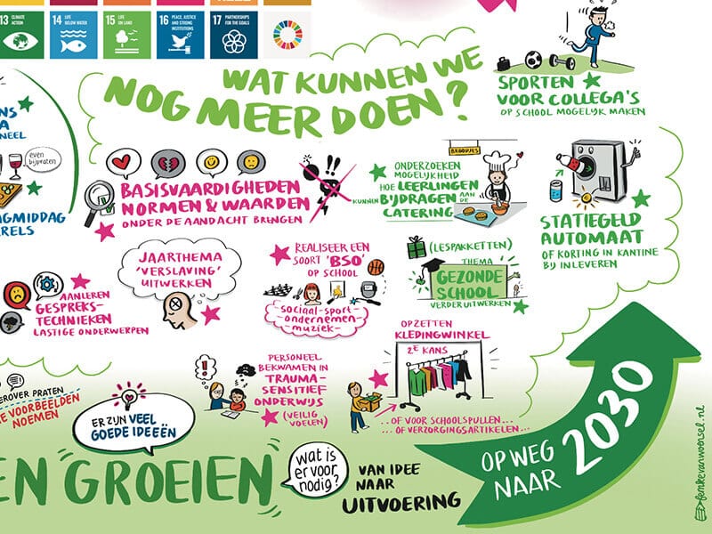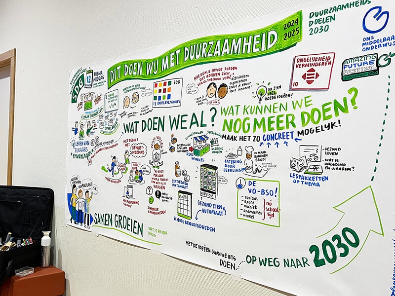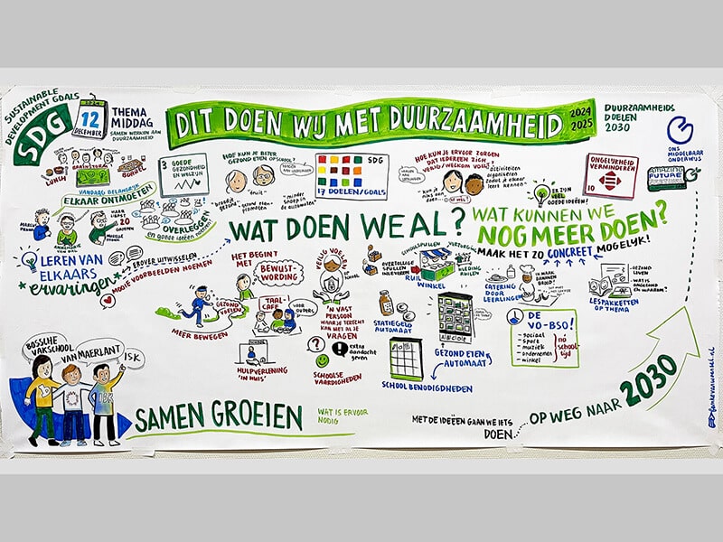 De digitale versie van deze SDG bijeenkomst hangt zichtbaar binnen de 3 scholen. Actief te zien wat al is bereikt en waaraan wordt gewerkt. De siual is op allerlei manieren te delen en te presenteren op diverse bijeenkomsten die gerelateerd zijn aan SDG.