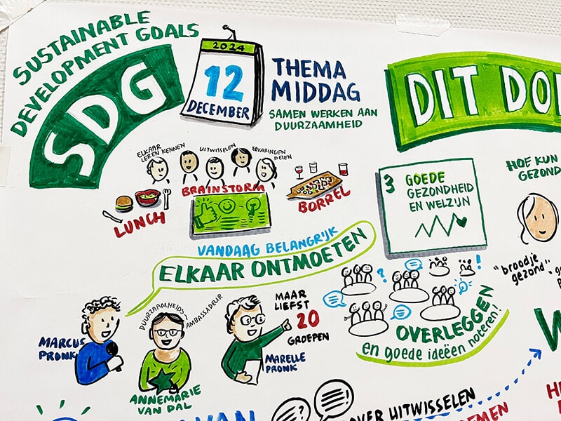Interactie, betrokkenheid, toegevoegde waarde, naslagwerk, poster om aan de muur te hangen. Zomaar wat voordelen van het laten maken van een visueel verslag tijdens een belangrijke bijeenkomst.