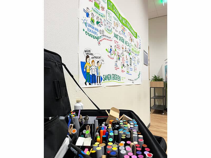 Laat mij een visueel verslag optekenen, live, met markers op een groot vel papier aan de muur. Het levert interactie en een waardevol naslagwerk op die ook de sfeer van de bijeenkomst vangt.