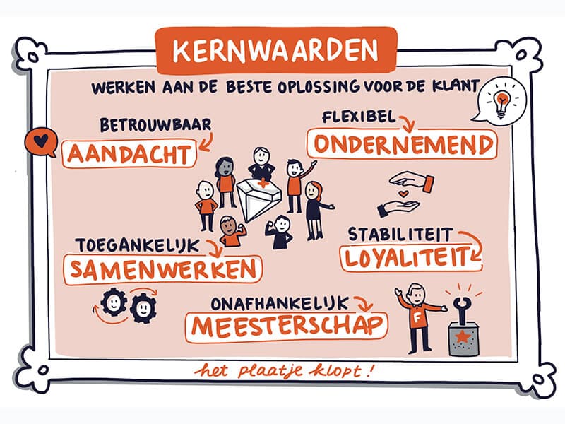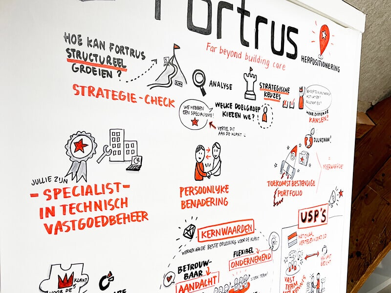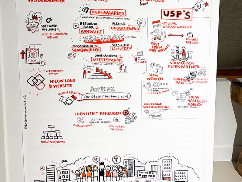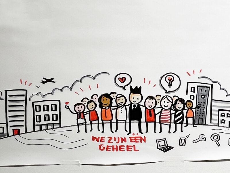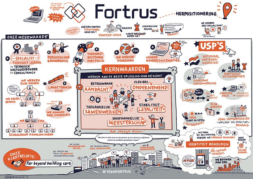 Met deze vraag realiseerde ik een live visual recording die ter plaatse in beeld bracht waar Fortrus voor staat. Compleet met introductie van een nieuwe huisstijl hebben zij een nieuwe, eigentijdse uitstraling gerealiseerd. Het teamgevoel binnen deze organisatie is groot en dat kwam tot uitdrukking in de illustratie die ik van deze groep maakte.