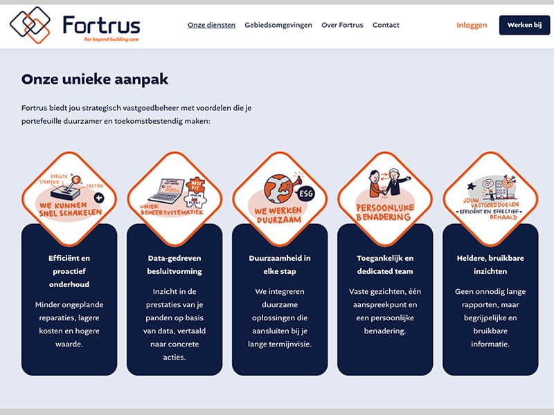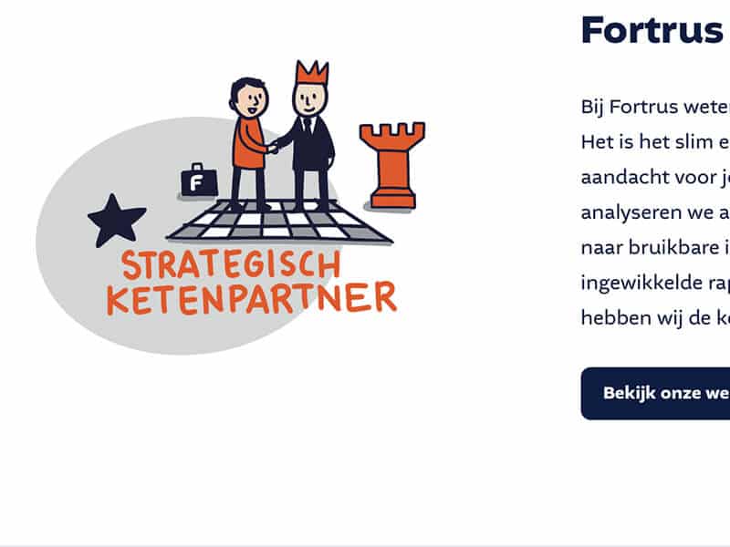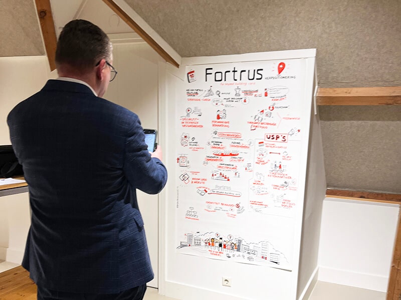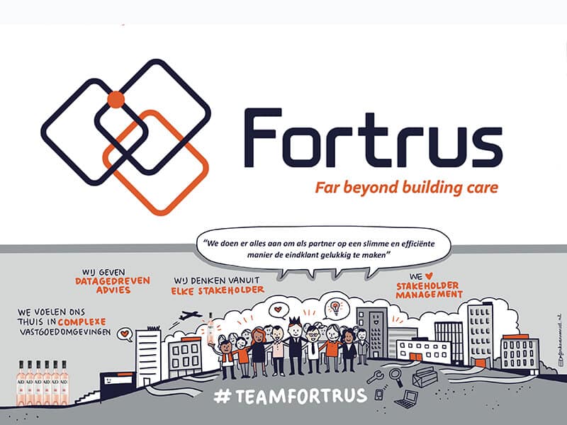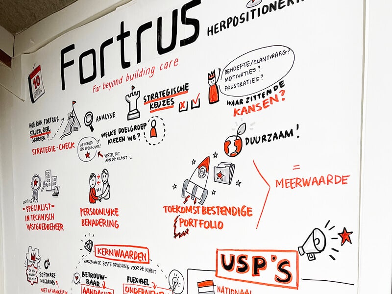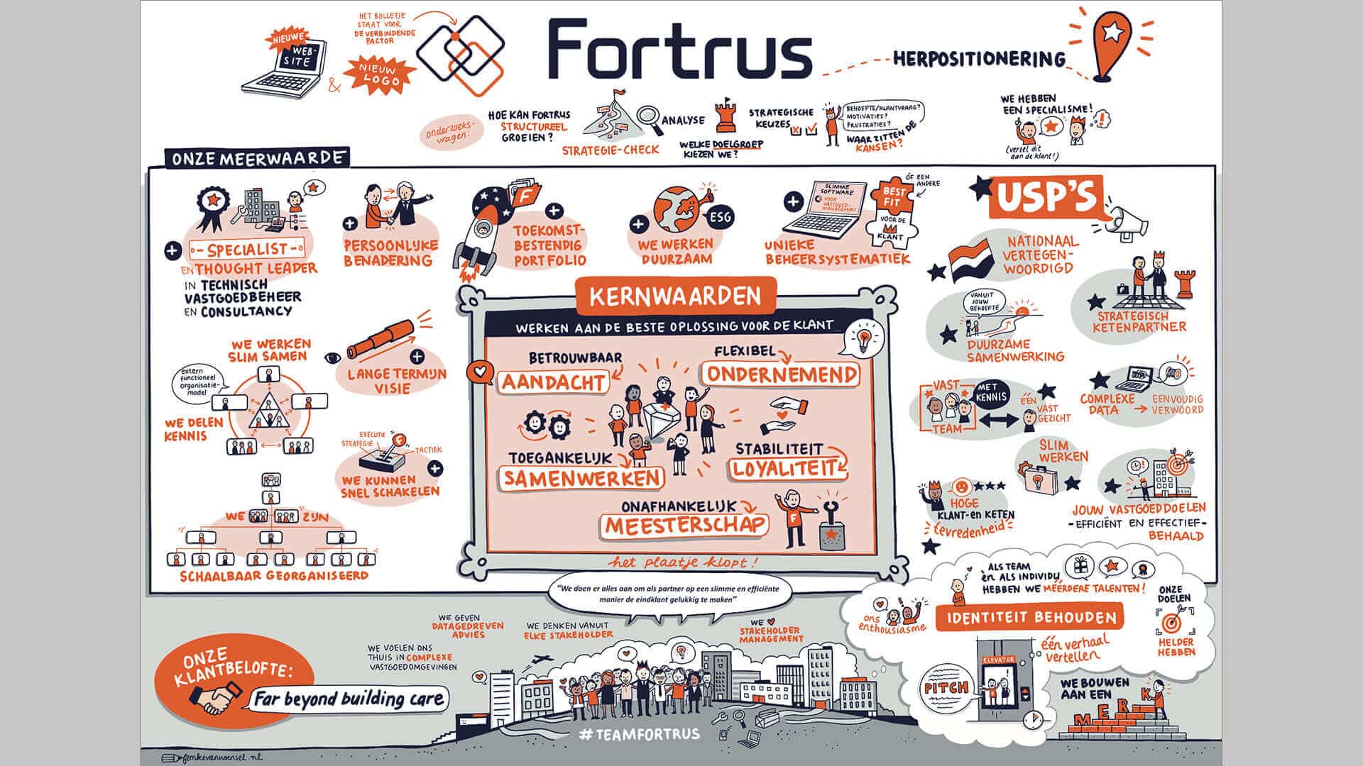 Na de live recording maakte ik het opgetekende digitaal en vulde de visual aan met USP’s en kernwaarden om het geheel compleet te maken. Op maat gesneden voor Fortrus, in de kleuren van de nieuwe huisstijl, met het nieuwe logo. De visual kan zodoende makkelijk toegepast worden binnen diverse communicatiekanalen.