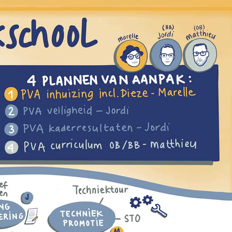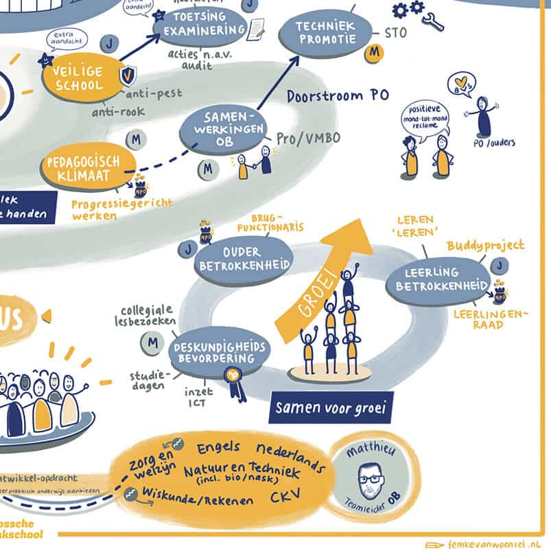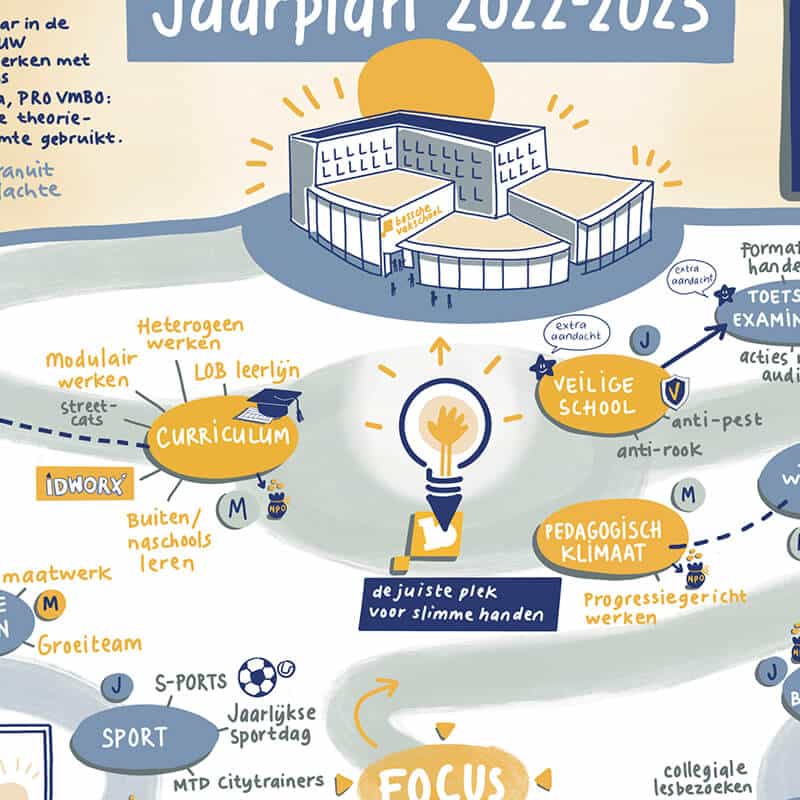 Met het zichtbaar maken van hun jaarplan in een tekening, laten ze op een aantrekkelijke en overzichtelijke manier zien waar ze aan werken. Voor een uiteenlopend publiek: niet alleen voor eigen medewerkers, maar ook voor alle partners waar zij mee samen werken, de onderwijsinspectie en ook ouders. Deze manier van communiceren is voor alle betrokkenen begrijpelijk en deze visual zal dan ook vaak worden aangehaald gedurende het jaar.