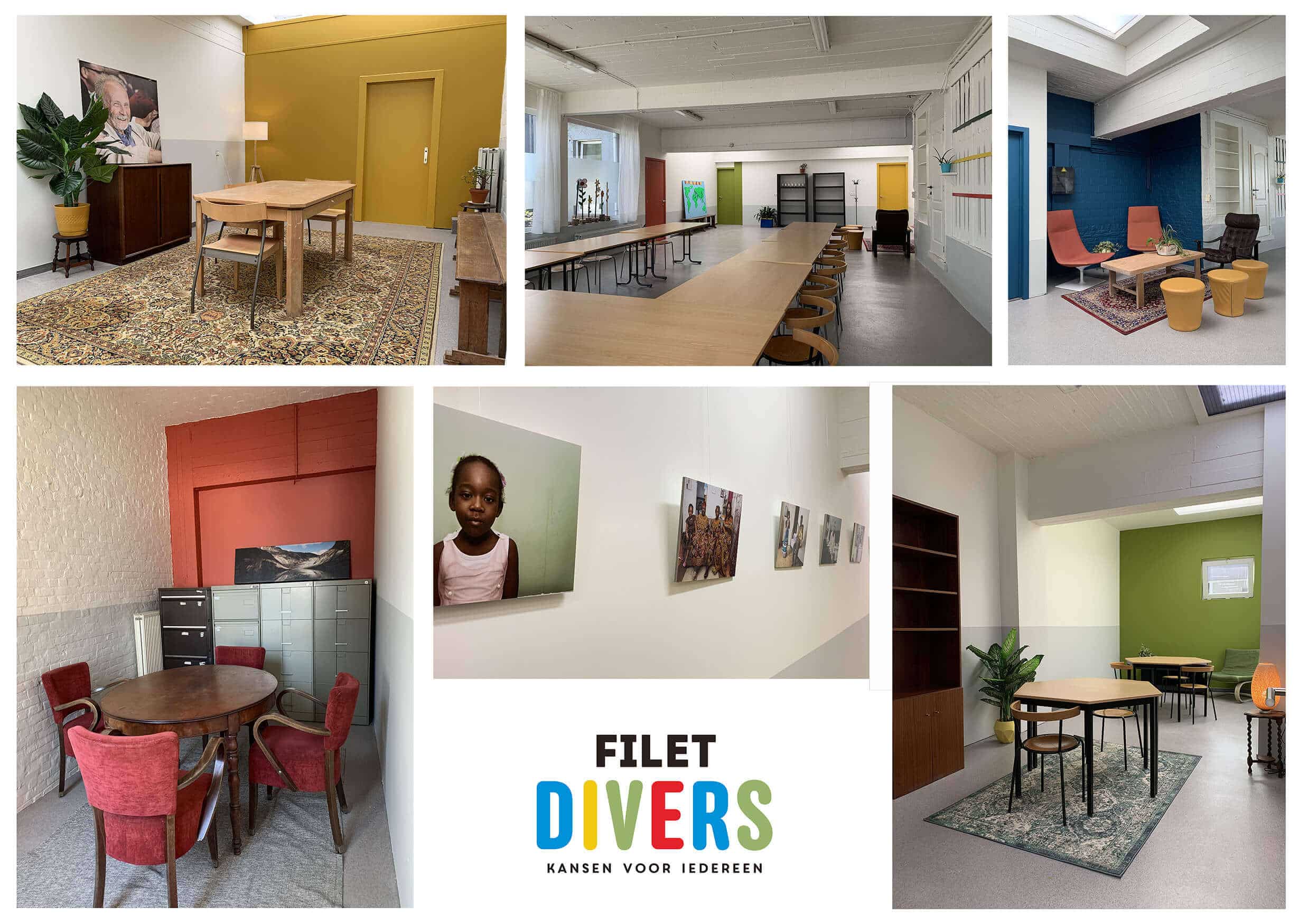 Het kleurenpalet, afgeleiden van het logo van Filet Divers, paste ik per ruimte toe, om zo ook makkelijker te ´navigeren´ in het gebouw. Ik zocht bestaand en (met veel genoegen) fantastisch tweedehands meubilair bij elkaar en vulde dit aan met hier en daar wat frisse nieuwe items. Een prachtige fotoserie over de doelgroep, siert de wand in de gang die de ruimtes met elkaar verbindt.