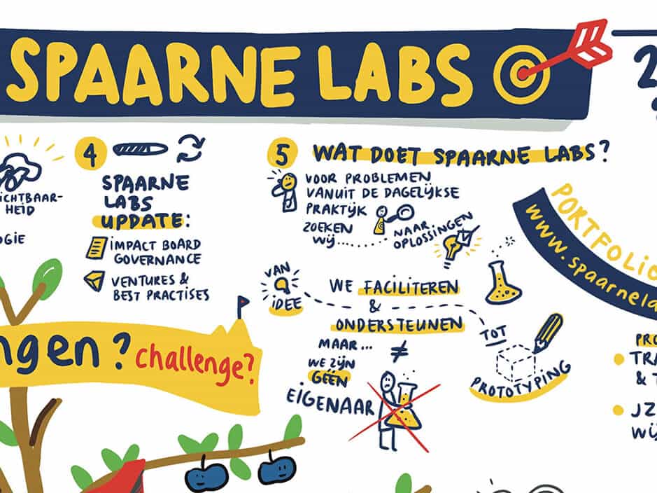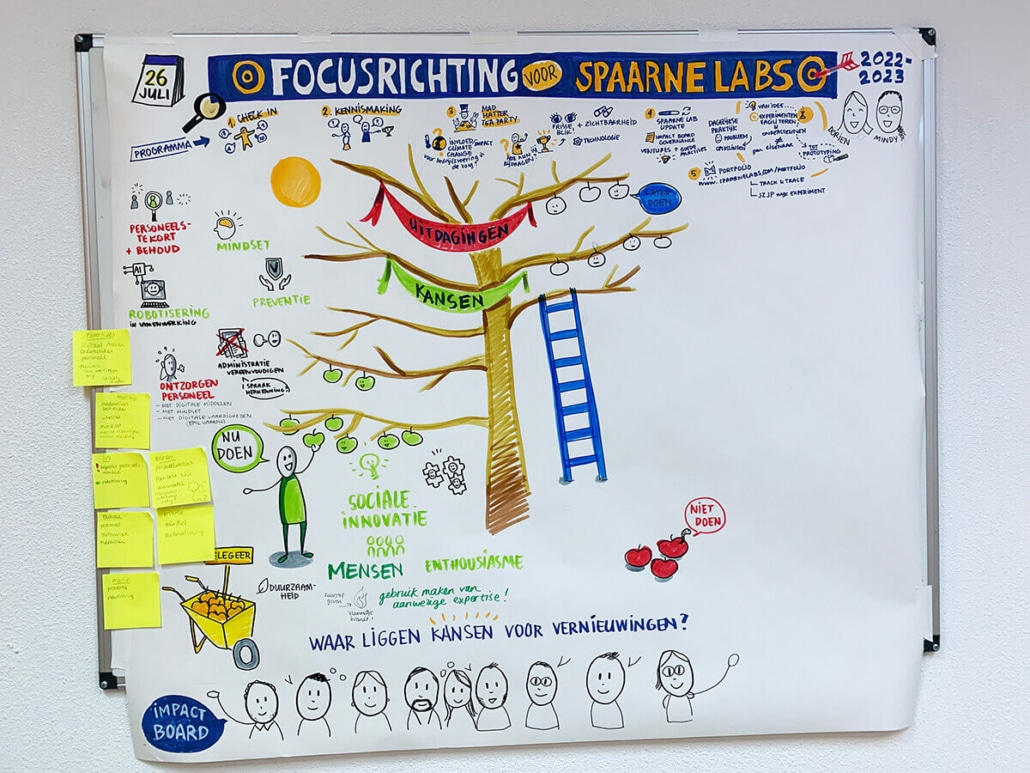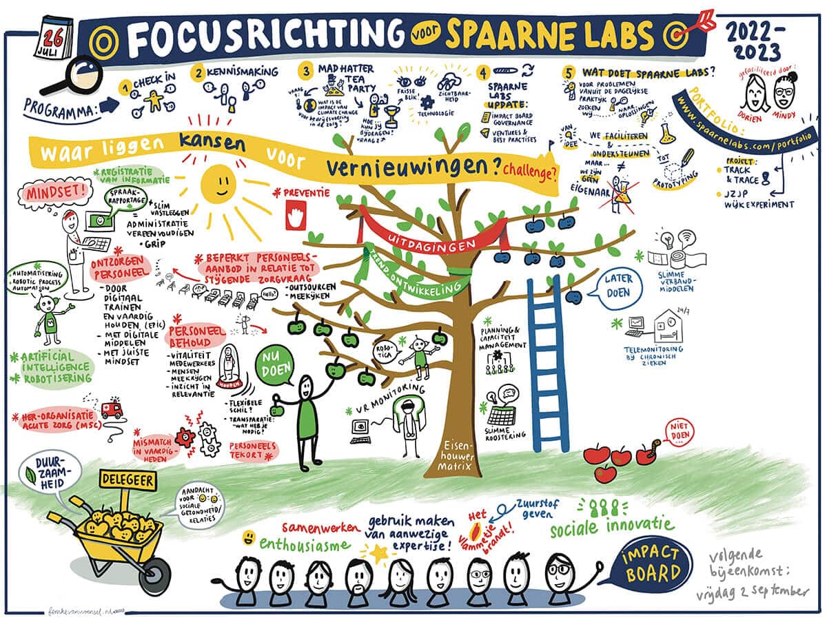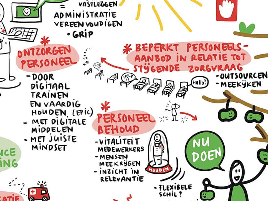 Met deze visual recording is zichtbaar gemaakt welke onderwerpen en innovaties er urgentie hebben. Met deze visuele samenvatting kunnen ze verder werken in volgende sessies, hij is digitaal gemaakt voor interne communicatie.
