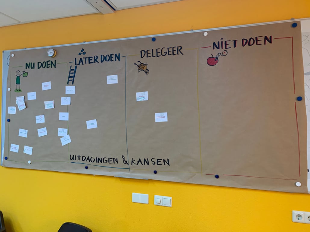 Er werd daarbij gekeken naar wat er meteen opgepakt moet worden, wat uitbesteed kan worden, wat later gedaan kan worden en wat geëlimineerd moet worden. Hiervoor werd de Eisenhouwer matrix in de metafoor van een boom met appels gebruikt.